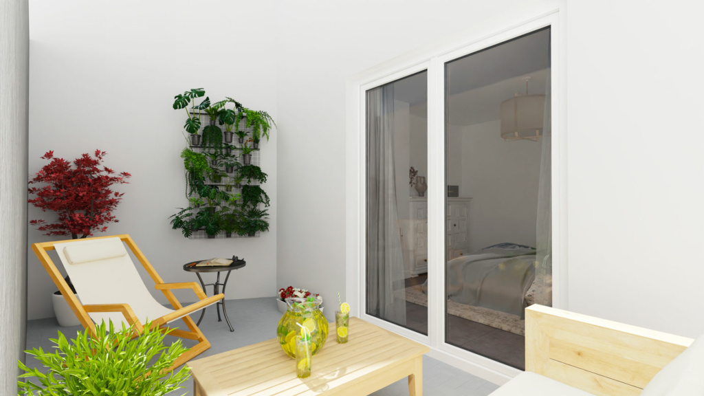 Appartement 0.1 – Type 3 en rez-de-chaussée avec terrasse et entrée privative. Images de synthèse non contractuelles.
